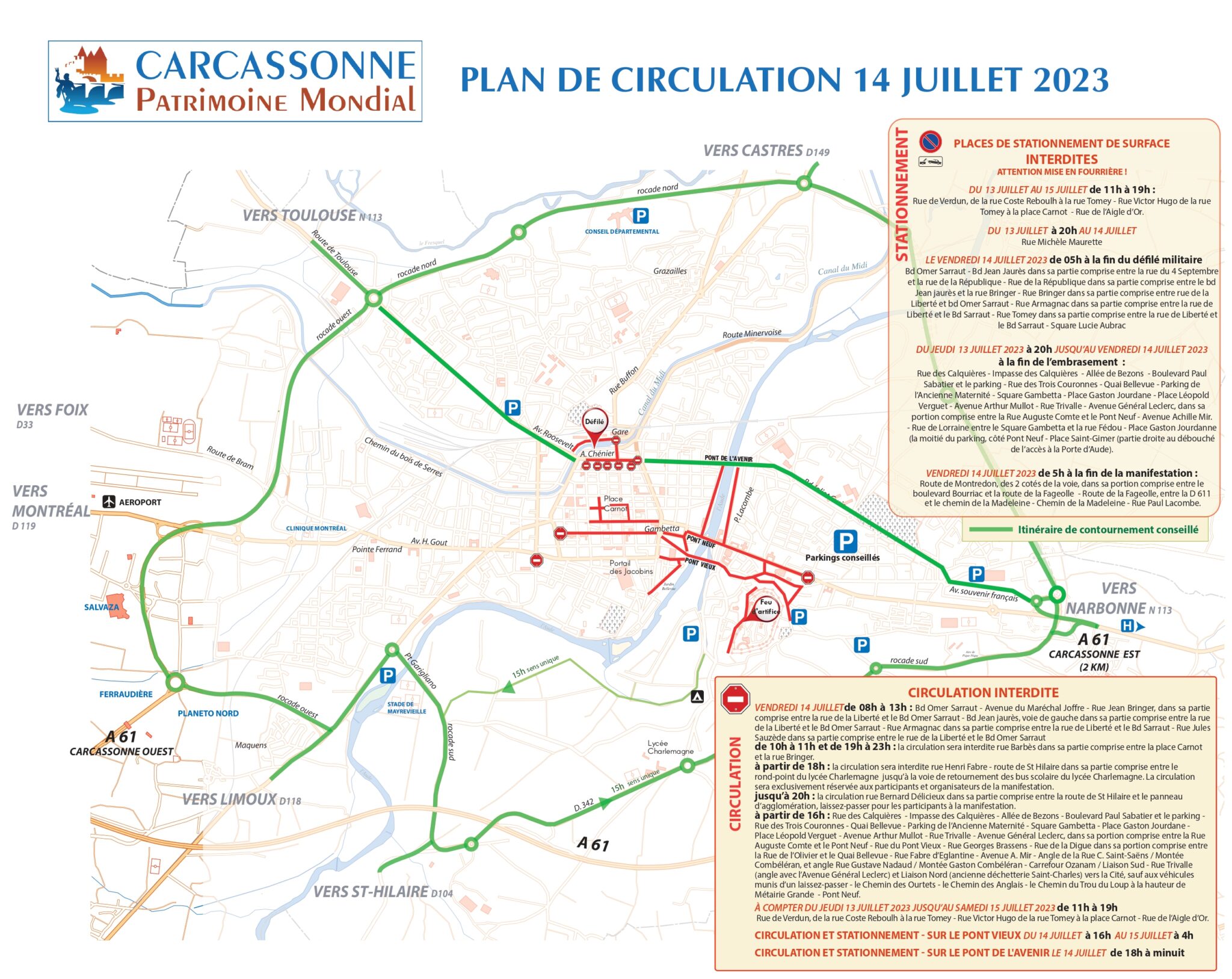 Wenn Sie das Feuerwerk um 22:30 Uhr am 14. Juli sehen möchten und Sie möglichst problemlos einen Parkplatz finden möchten, dann ist es ratsam, am späten Vormittag oder frühen Nachmittag in Carcassonne einzutreffen. Sie können auf einem der großen Parkplätze in der Nähe der Altstadt parken. Gehen Sie von der historischen Altstadt aus in Richtung Stadtzentrum (20 Min. zu Fuß), wo Sie das Feuerwerk vom Ufer des Flusses Aude aus oder von den Brücken, die der Altstadt gegenüber liegen, bewundern können.