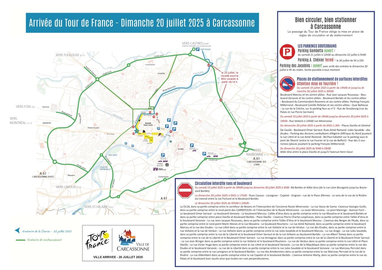 On the occasion of the arrival of the 15th stage of the Tour de France 2025 in Carcassonne, traffic and parking restrictions are being implemented to ensure the safety of all and the smooth running of the event.